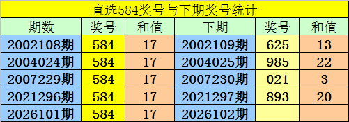 第2026101期3D奖号为:584,历史上该号码直选开出5次,下期号码分别为:625、985、021、893。